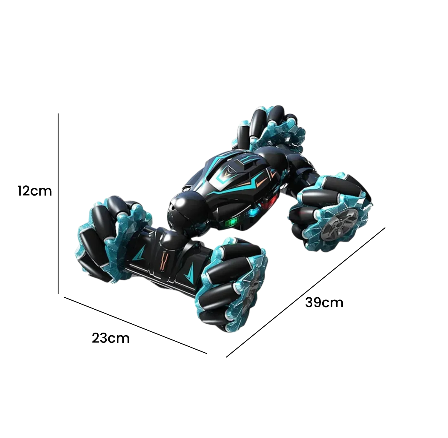Movimientos: Giro 360° y transformaciones Control: Remoto inalámbrico de largo alcance Material: Plástico ABS resistente Tamaño: Compacto y fácil de manejar Usos: Diversión en interiores y exteriores