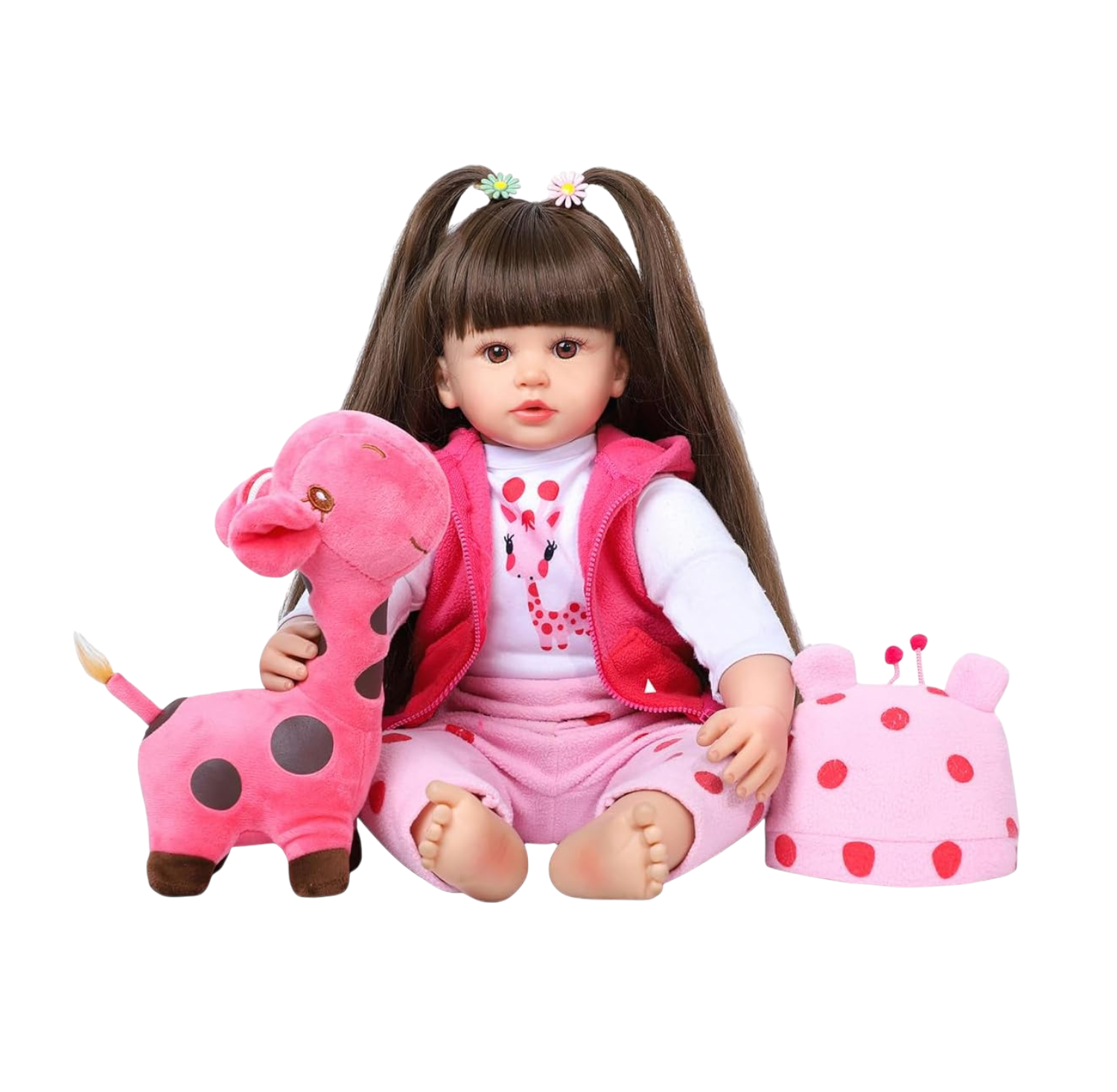 Tamaño: 60 cm aproxPeso: 1,6 kg aproxMaterial: Silicona (extremidades y cabeza)Cuerpo: Algodón suaveOjos: AcrílicosCabello: Peluca de seda adheridaAccesorios: Jirafa de peluche + gorroUso: Ideal para juegos imaginativos