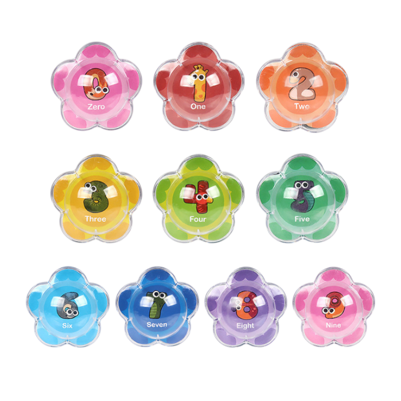 Material: Plástico resistenteTamaño: 5,5 × 5,5 cmEstilo: Números + animalesIncluye: Set de 10 unidades en colores variados