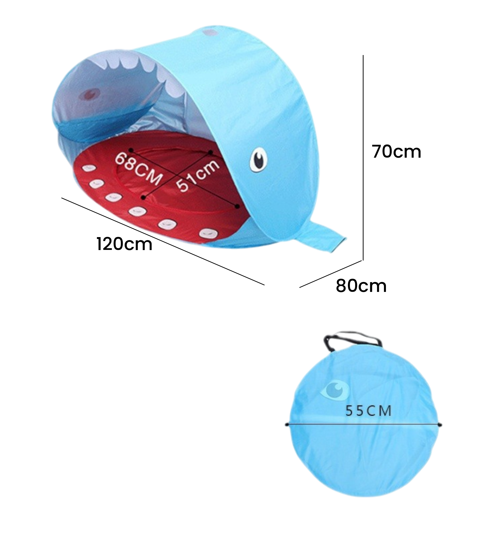 Dimensiones: 120 × 80 × 70 cmMaterial: Tafetán de poliéster con revestimiento de plataColor: AzulUso: Apto para sombra y juegos en exteriores
