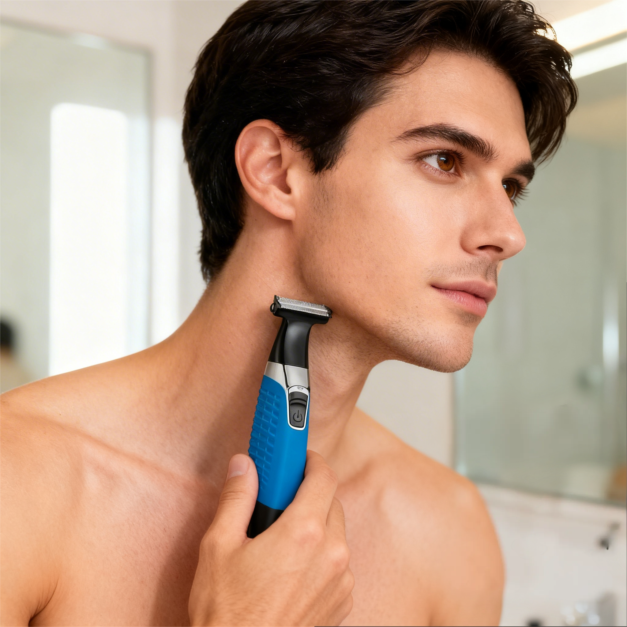 Depiladora azul recargable con cuchillas de acero inoxidable, ideal para un uso seguro y eficiente.