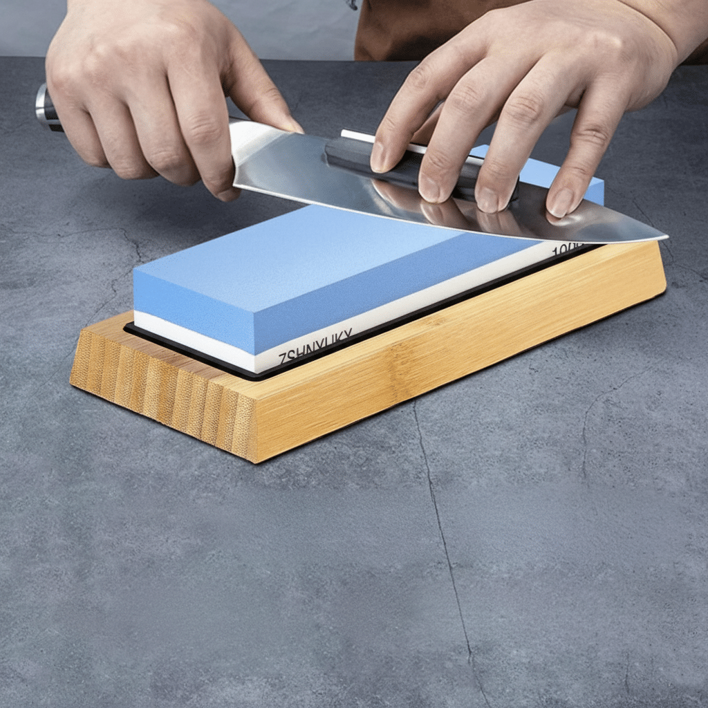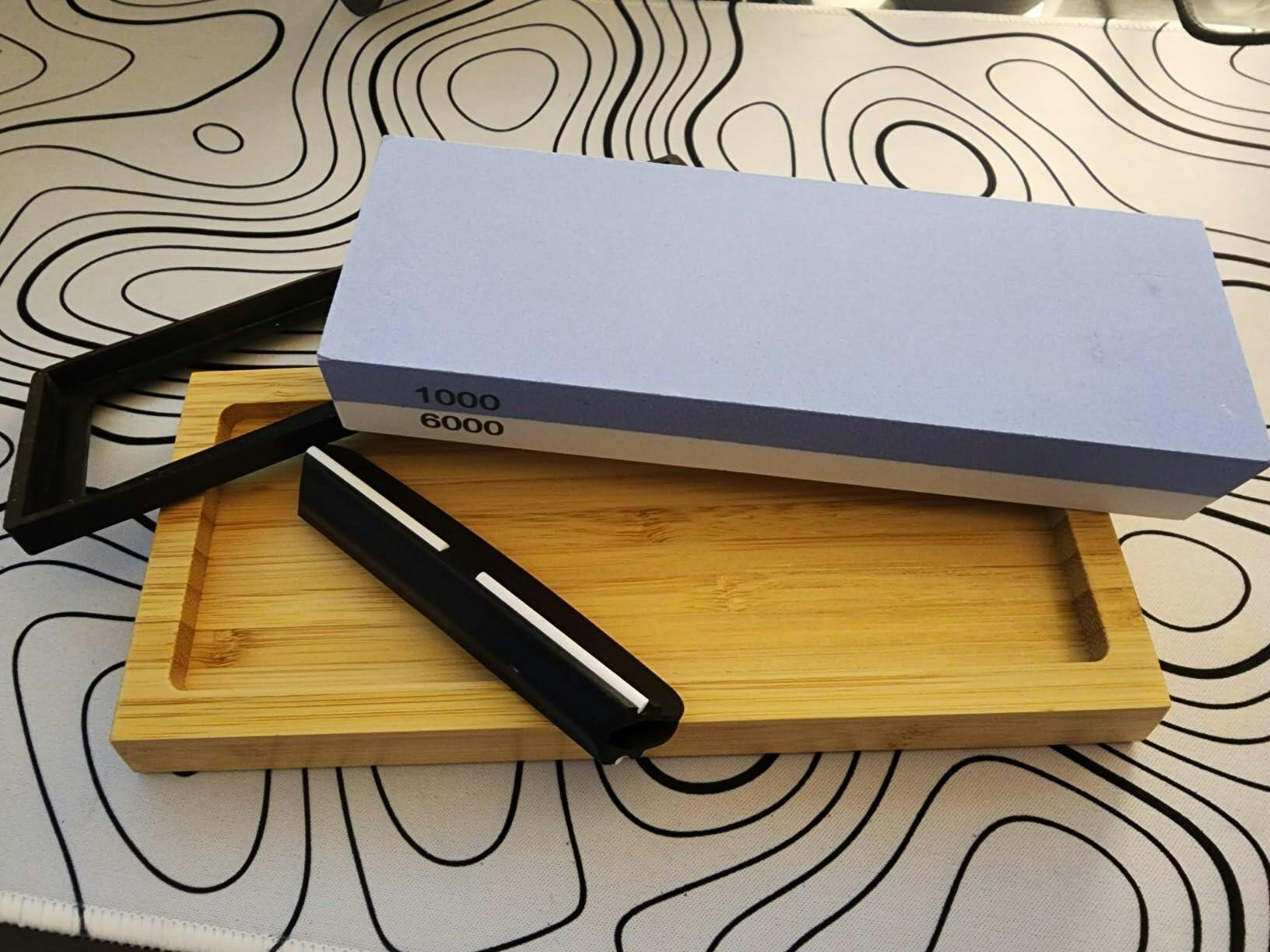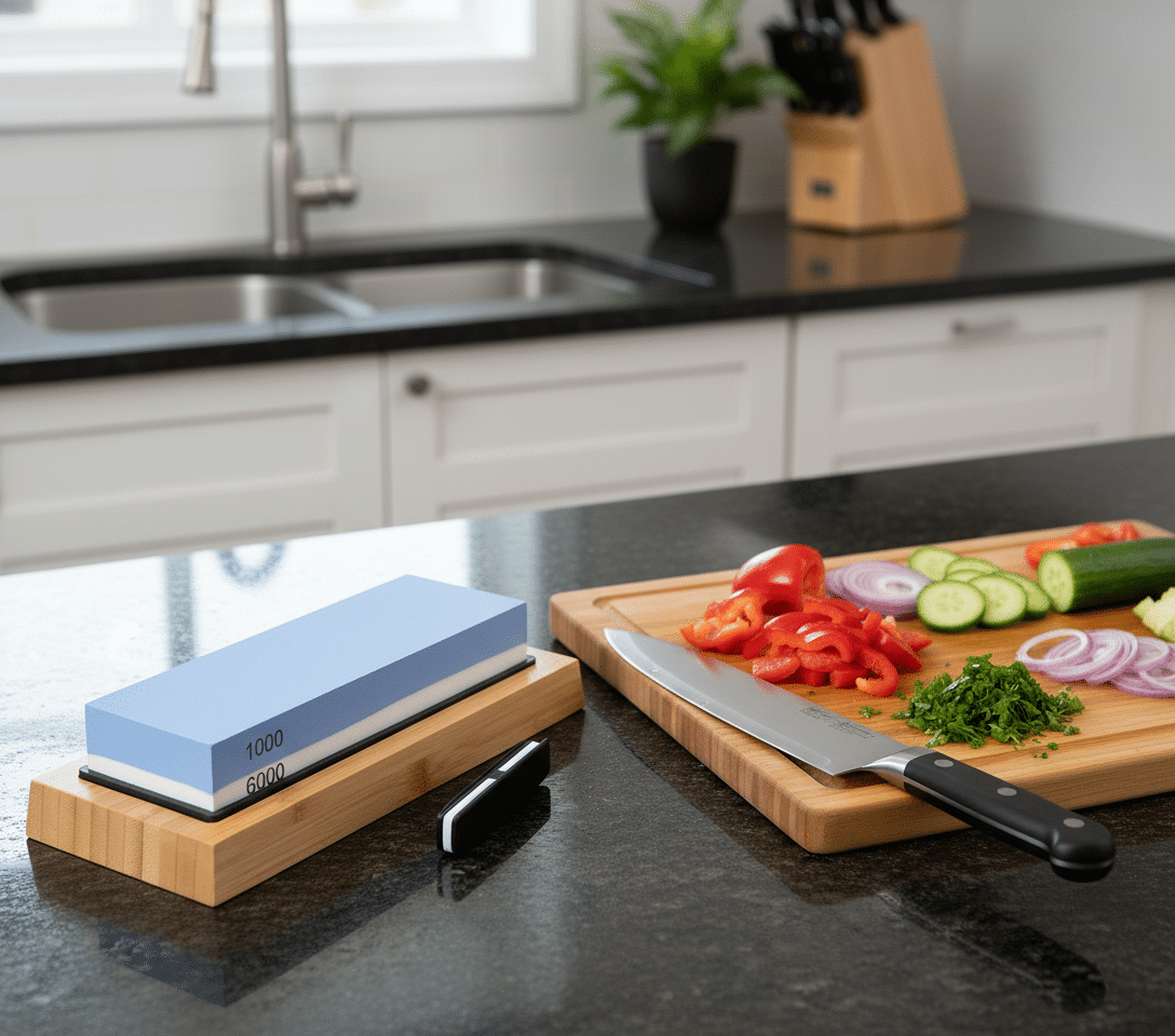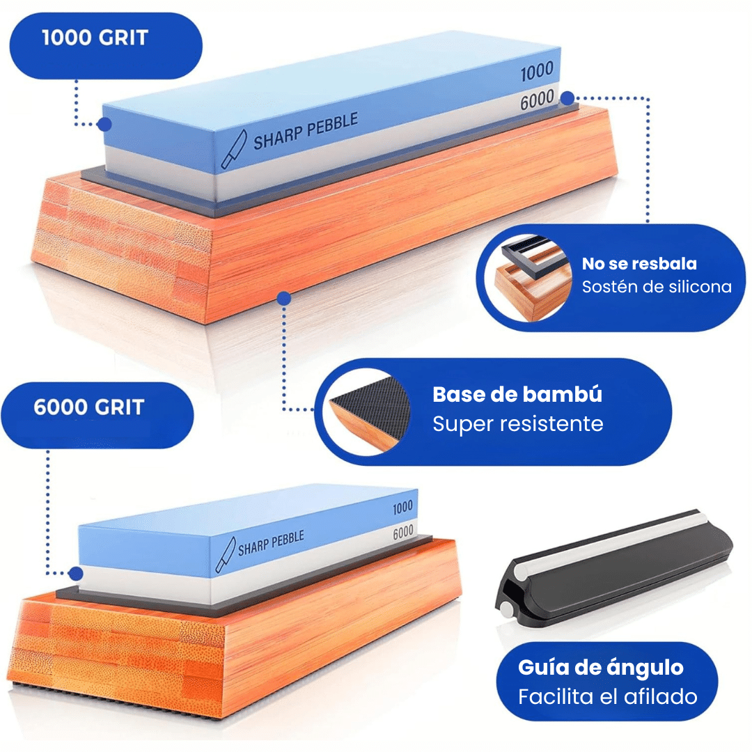 Con esta piedra de afilar con base de bambú y portacuchillos, mantené tus cuchillos siempre listos.