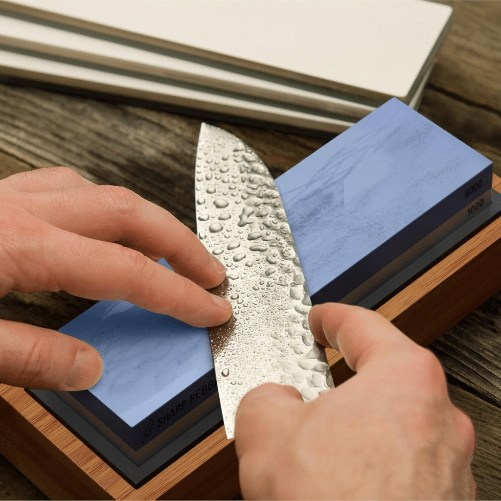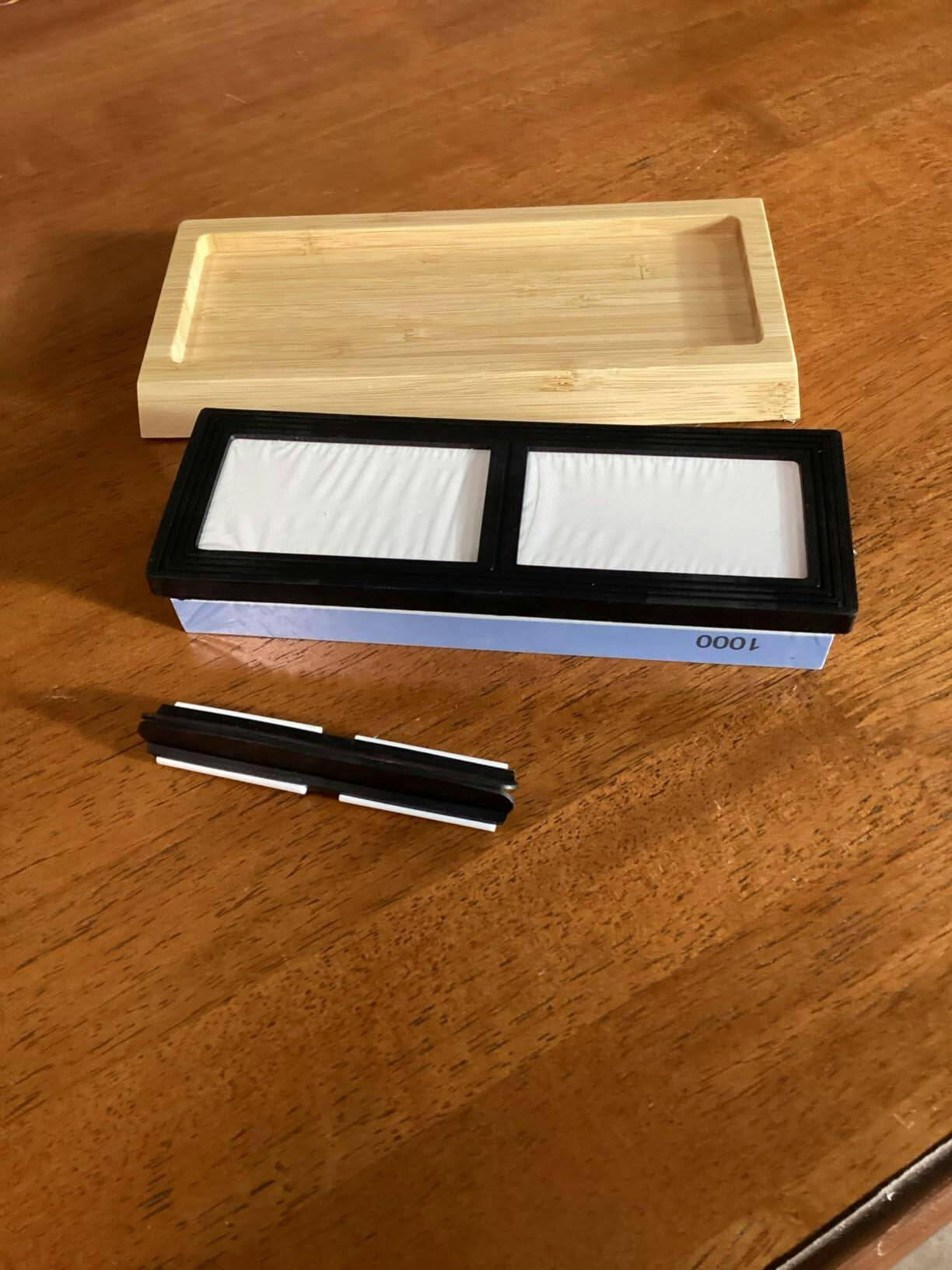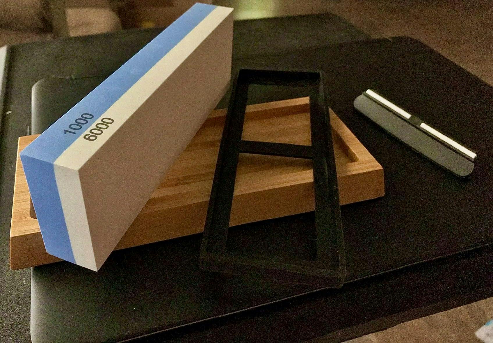 Con esta piedra de afilar con base de bambú y portacuchillos, mantené tus cuchillos siempre listos.