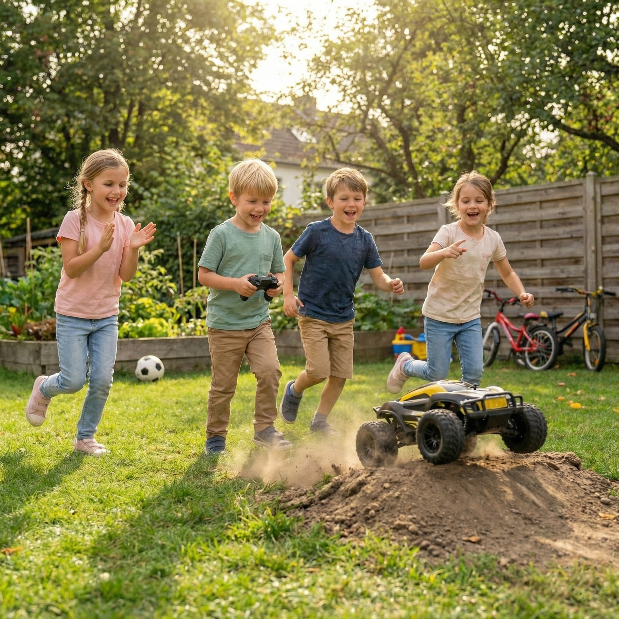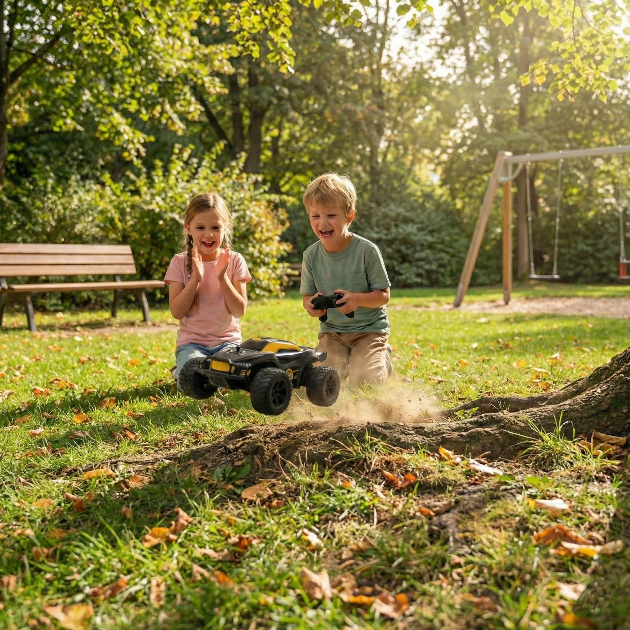 Equipada con tracción 4x4 y ruedas resistentes, enfrenta piedras, tierra y pasto como un verdadero todo terreno.