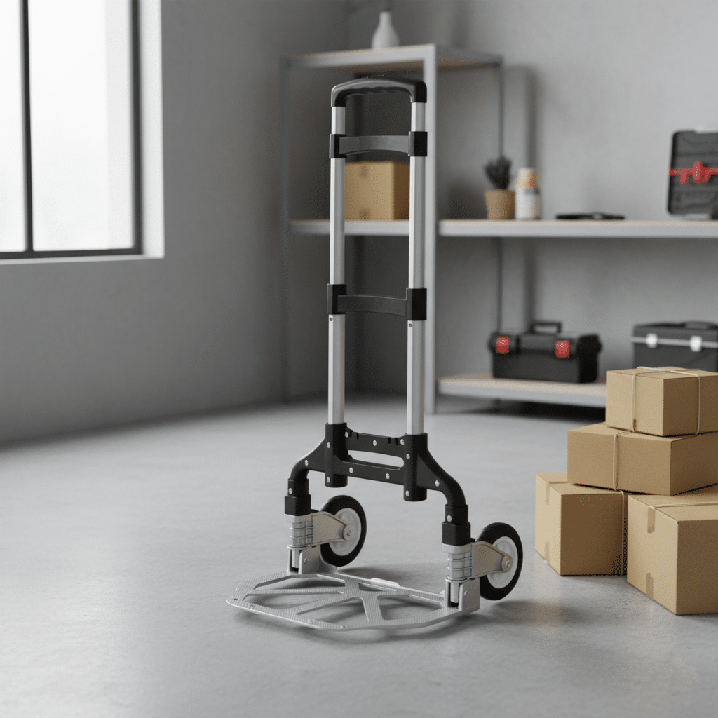 Carro de mano plegable y liviano, ideal para cargas pesadas. Resistente y fácil de guardar.