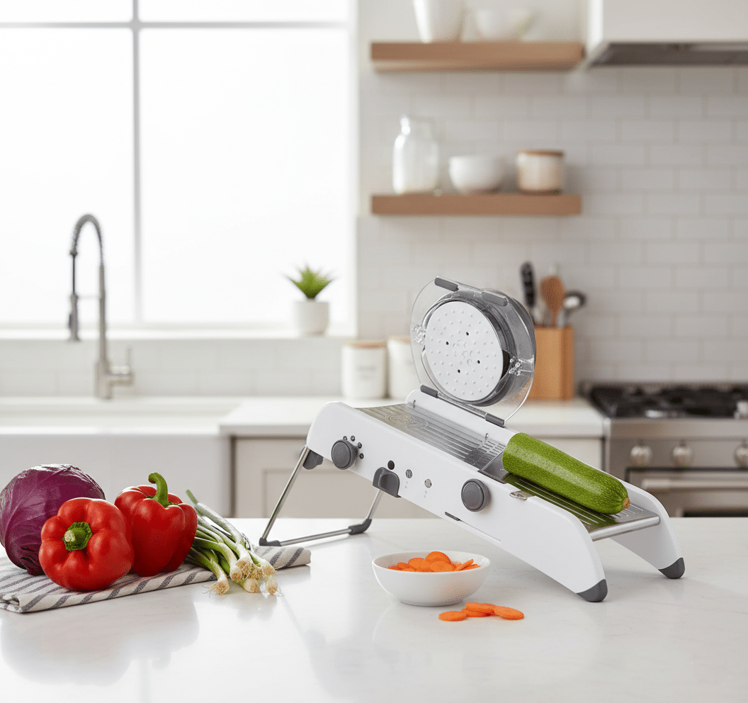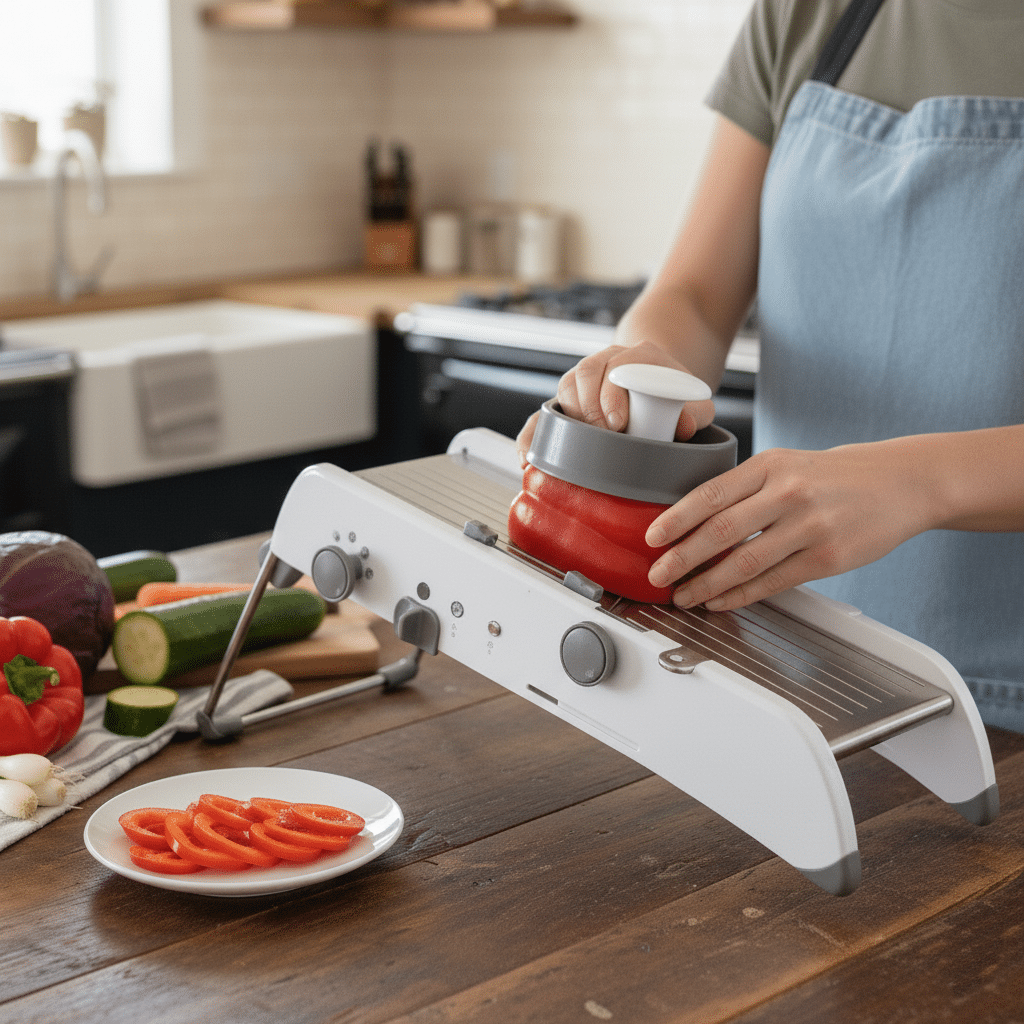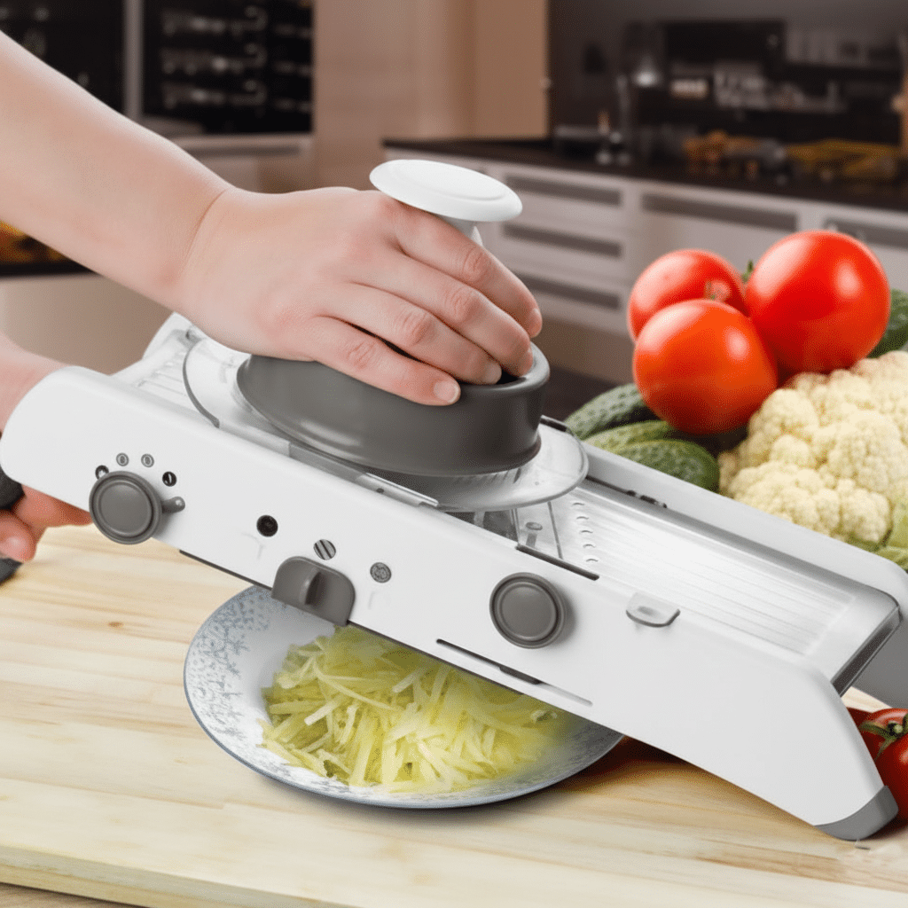 Cortador de alimentos tipo mandolina de acero inoxidable. Preciso, rápido y práctico para tus comidas.