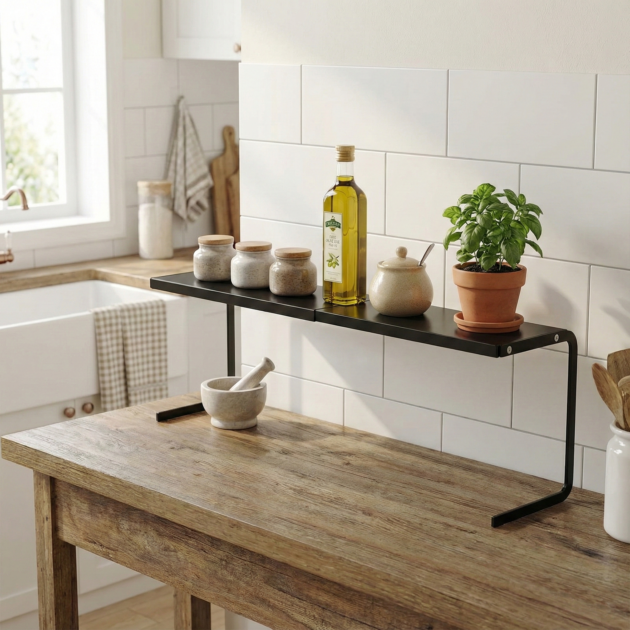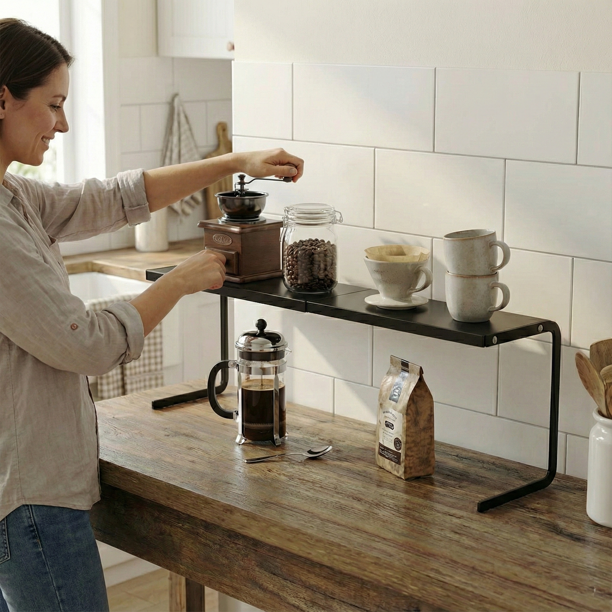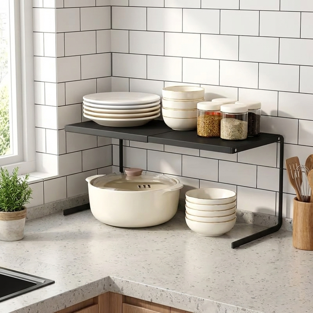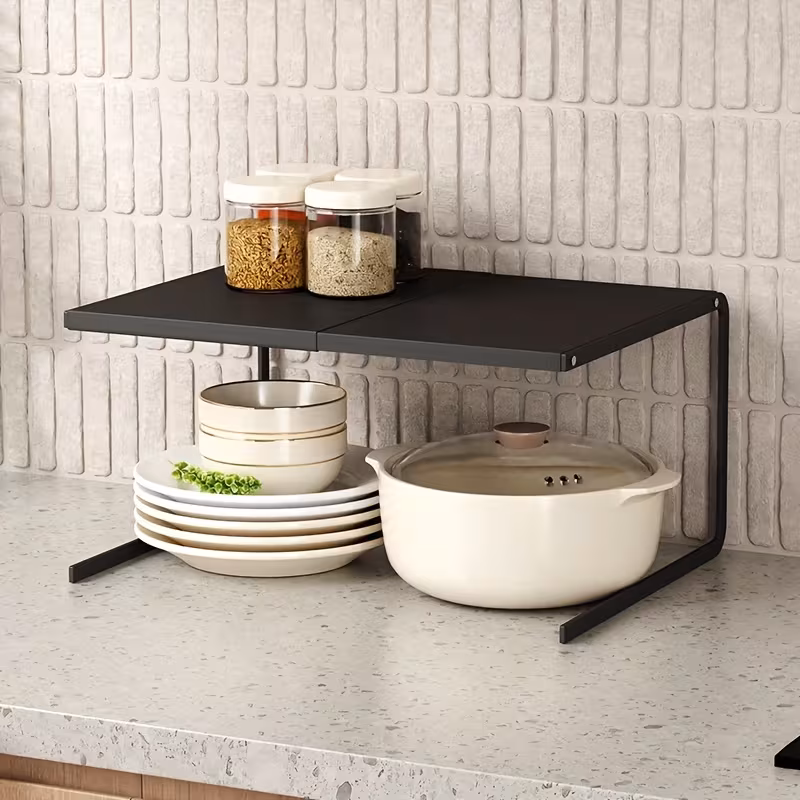 Estante organizador extensible ideal para aprovechar mejor el espacio en cocina, baño o placard.