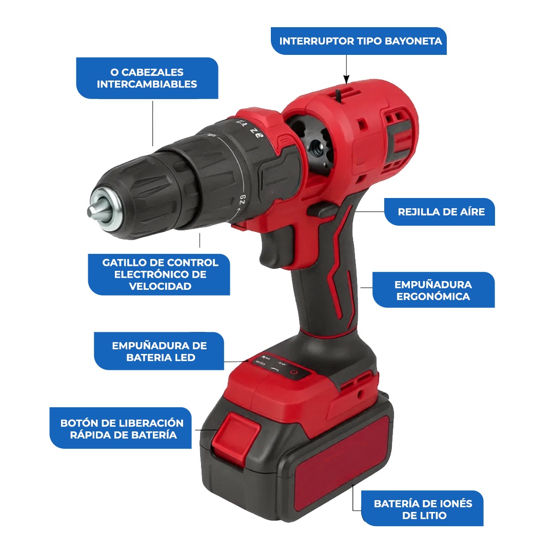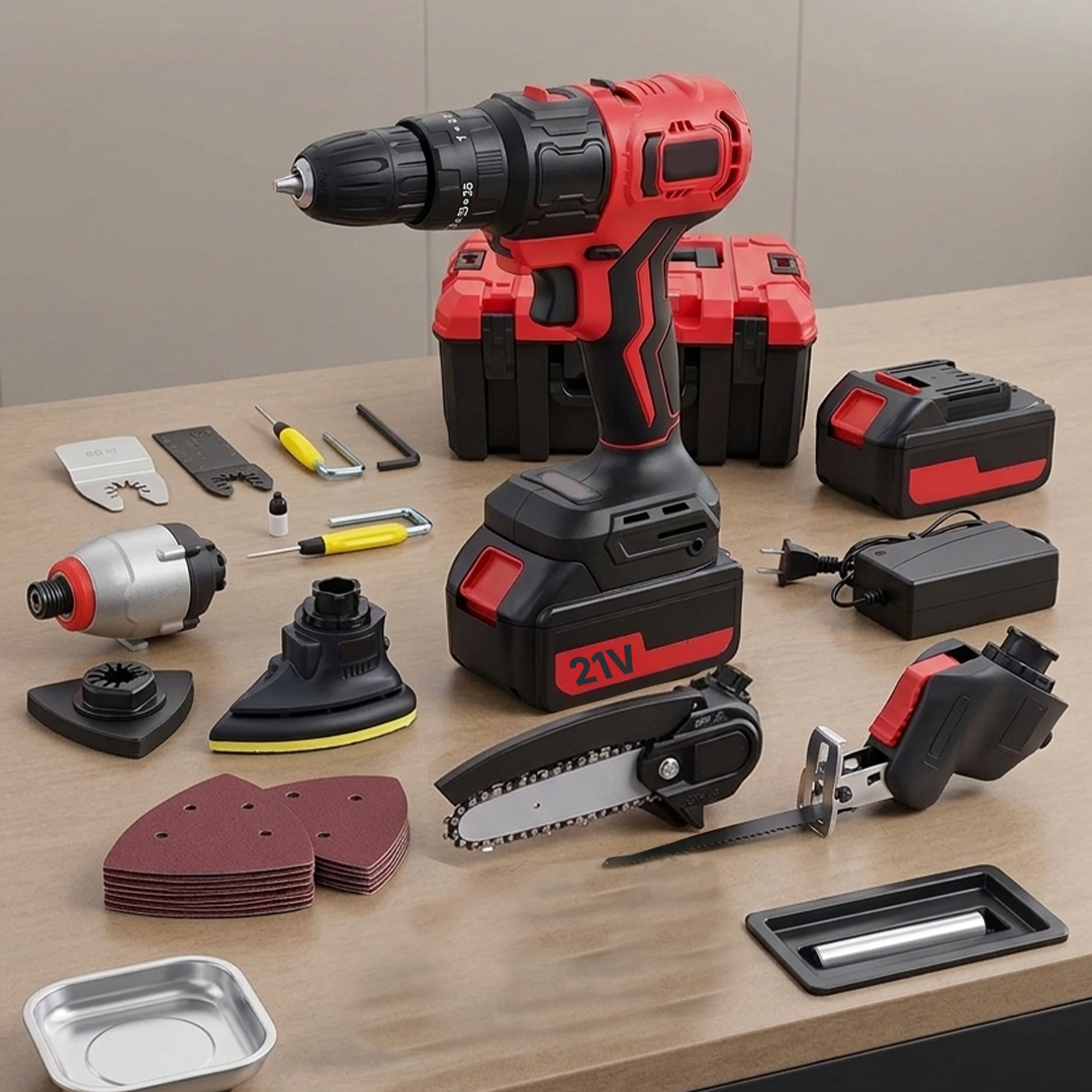 Plástico de alta densidad + Aleacion de metal resistente a caidas Voltaje: 21V (Batería recargable) Versatilidad: Inalambrico con bloqueos de seguridad Incluye: Motosierra de cadena + Lijadora (+3 Repuestos) + Pulidora Cortadora de perfiles + Atornilladora + Taladro de impacto + Sierra Cargador + 2 Destornilladores + Llave en L + Sierra de corte + Valija de guardado con cierre por click + 1 Batería