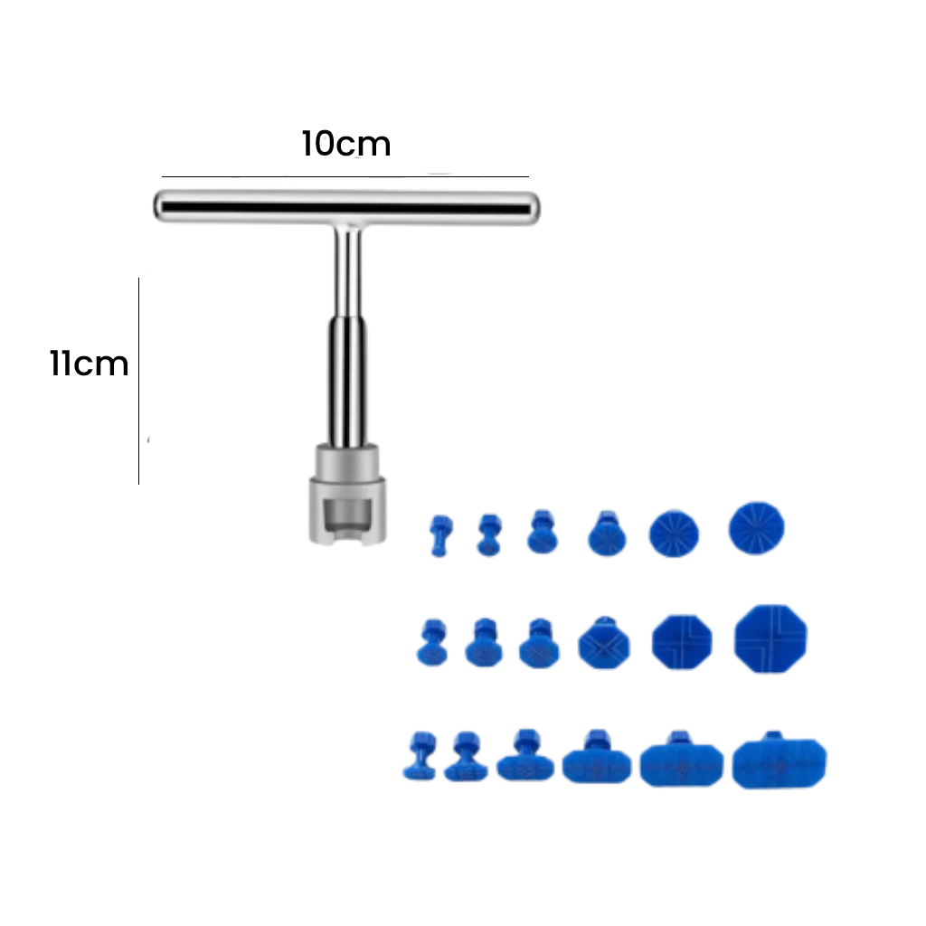 Incluye manija en forma de T y 18 piezas que se adaptan a diferentes tamaños de abolladuras.