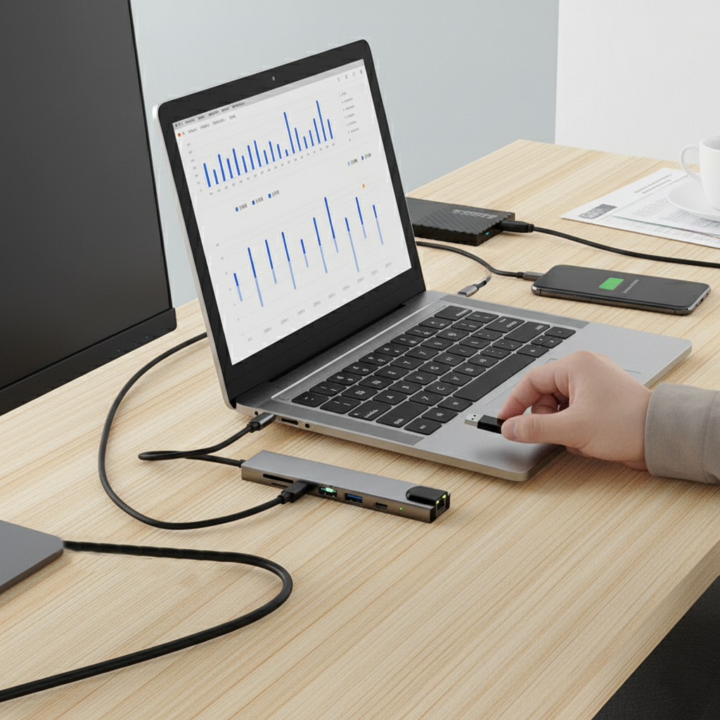 Transformá tu dispositivo con esta estación de acoplamiento 8-en-1 que ofrece múltiples puertos y compatibilidad.