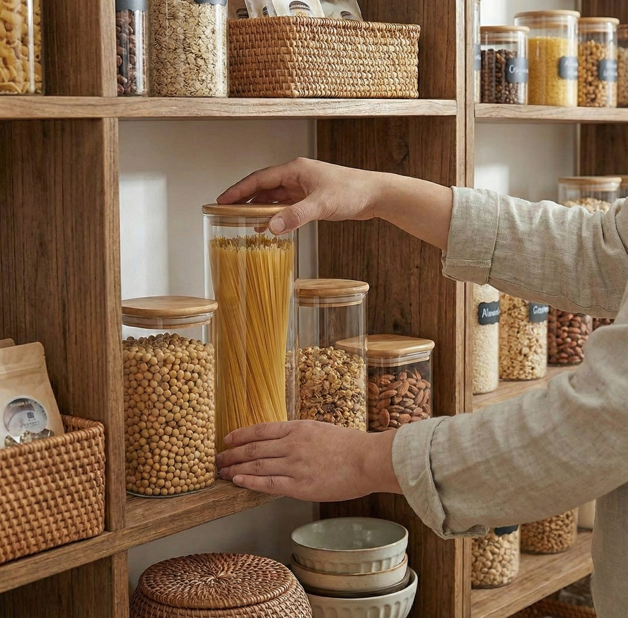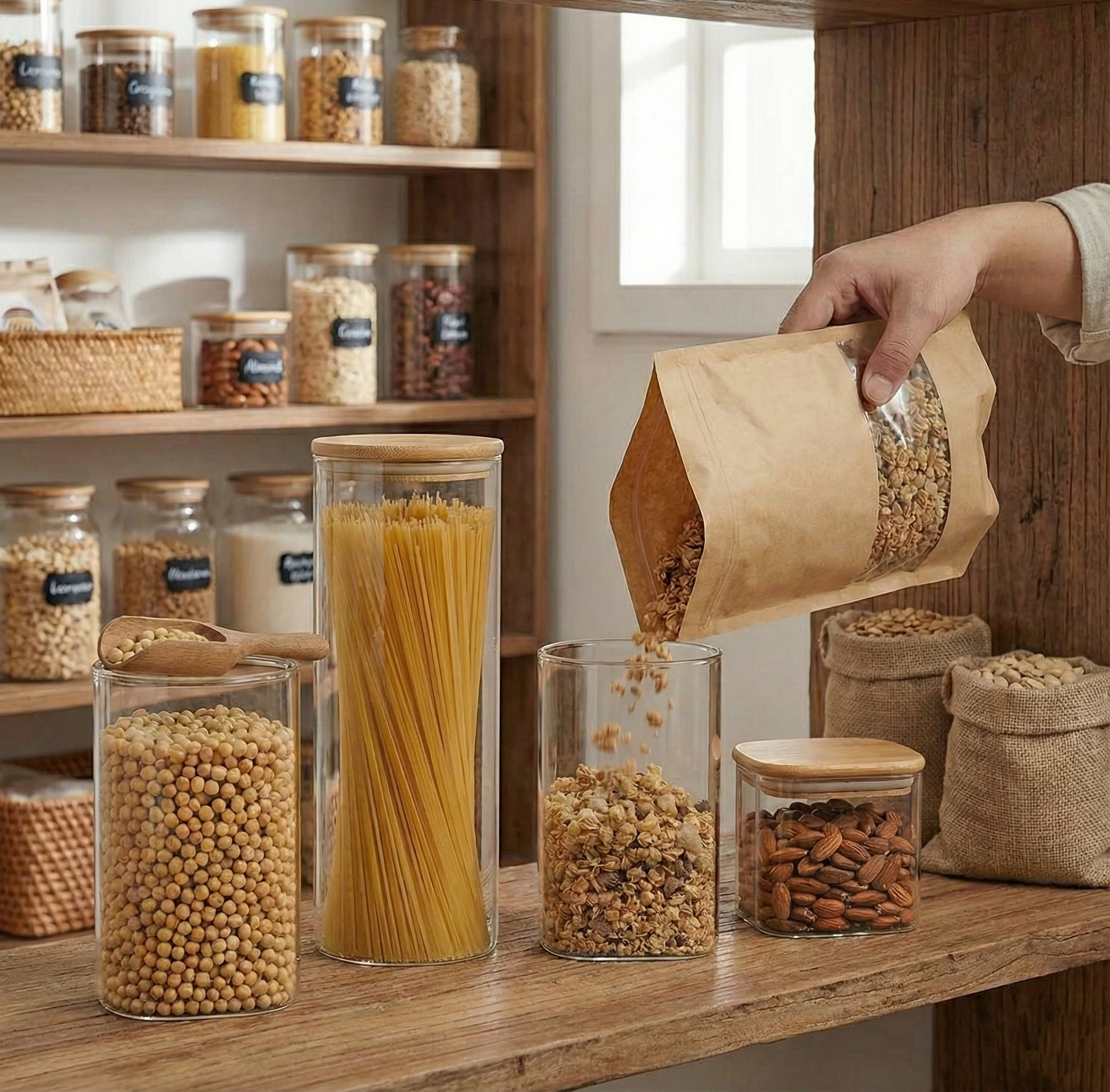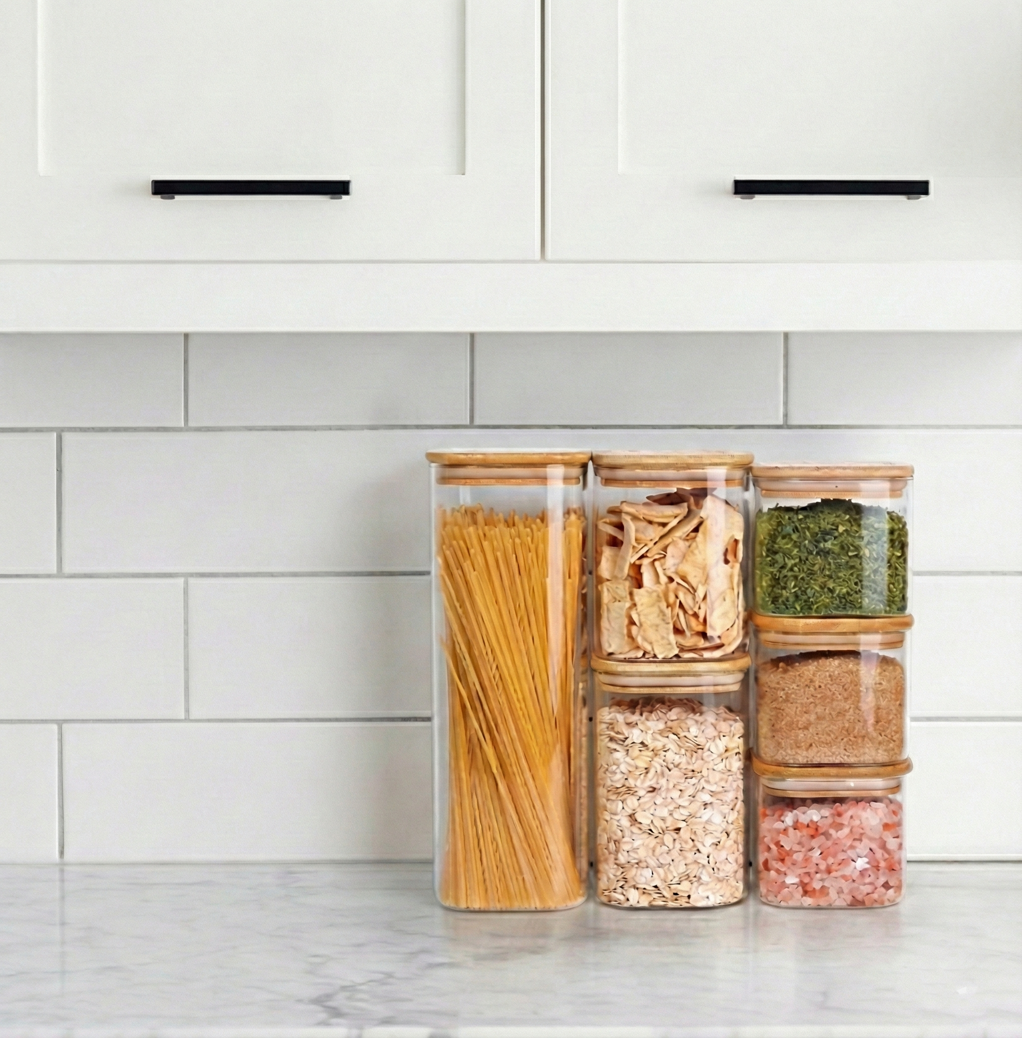 Set variado que permite guardar distintos tipos de alimentos secos, manteniendo todo a la vista.