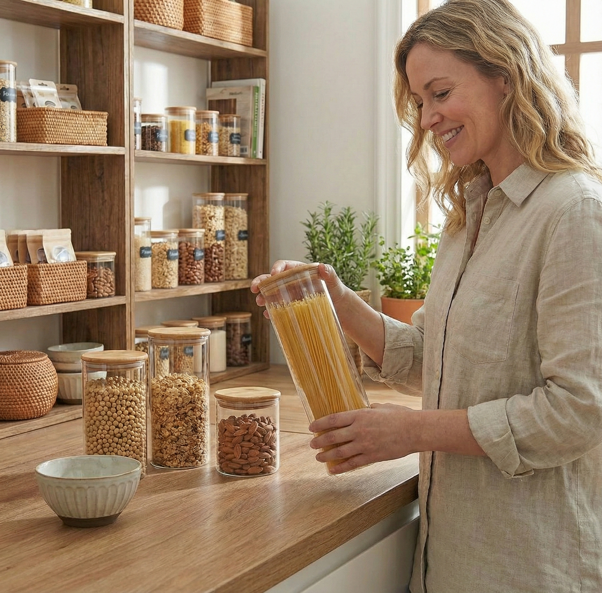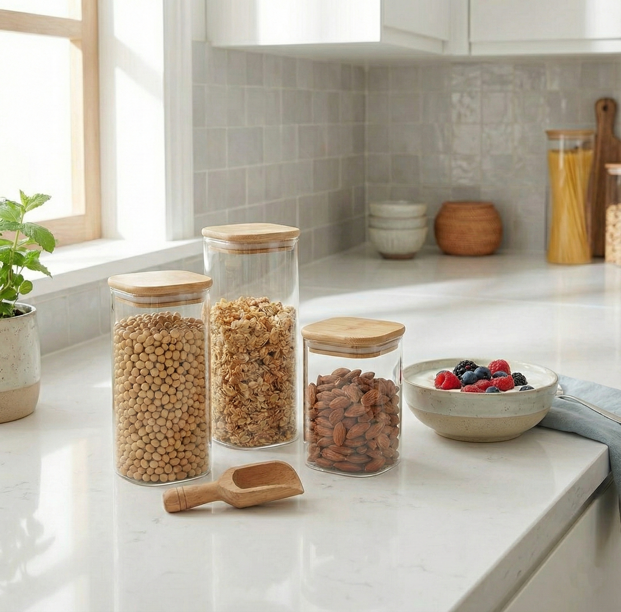 Fabricados en vidrio borosilicato con tapa de bambú, ideales para un uso diario en la cocina.