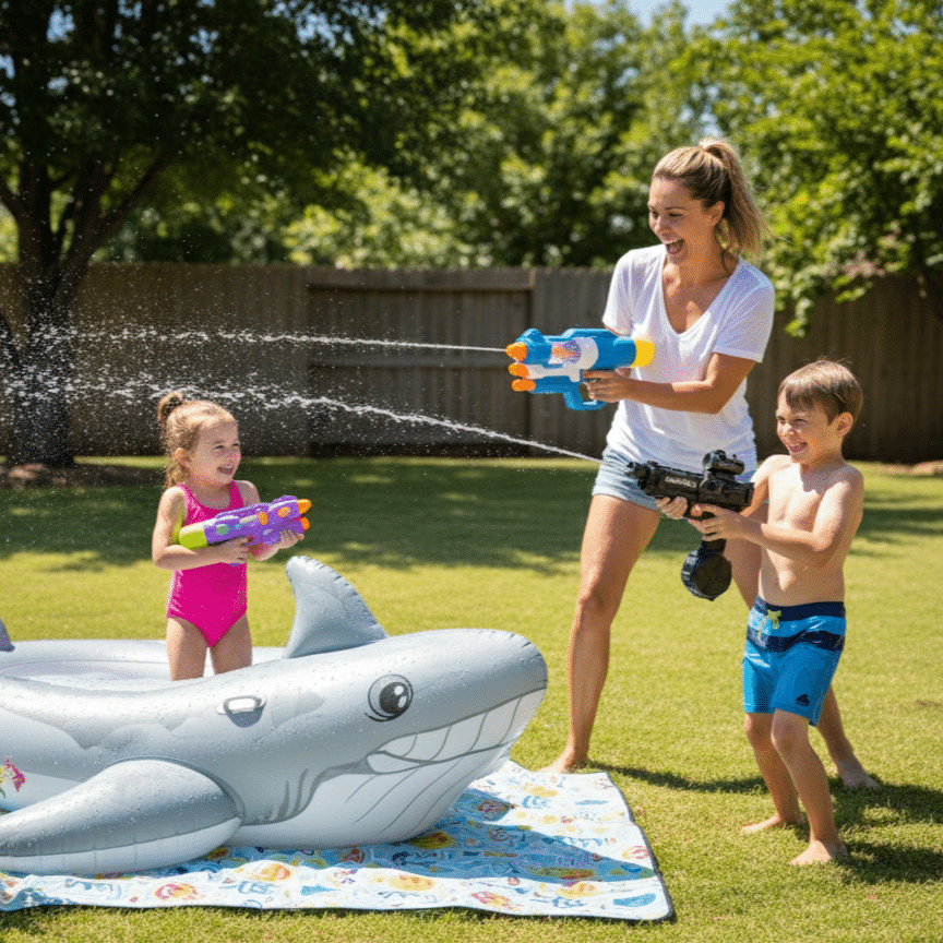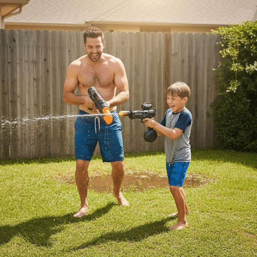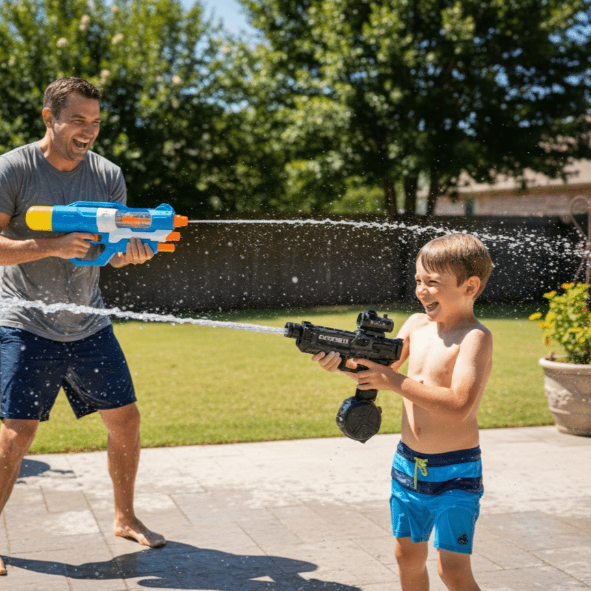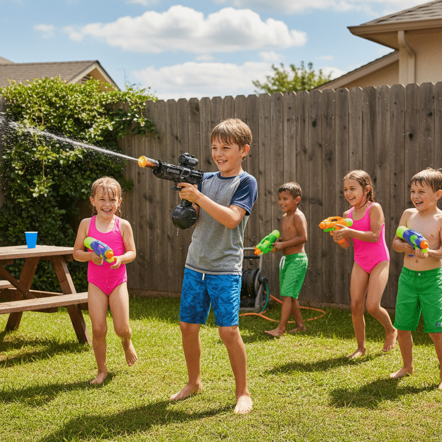 Este juguete lanzador de agua eléctrico es ideal para jugar en el jardín, la playa o la plaza.