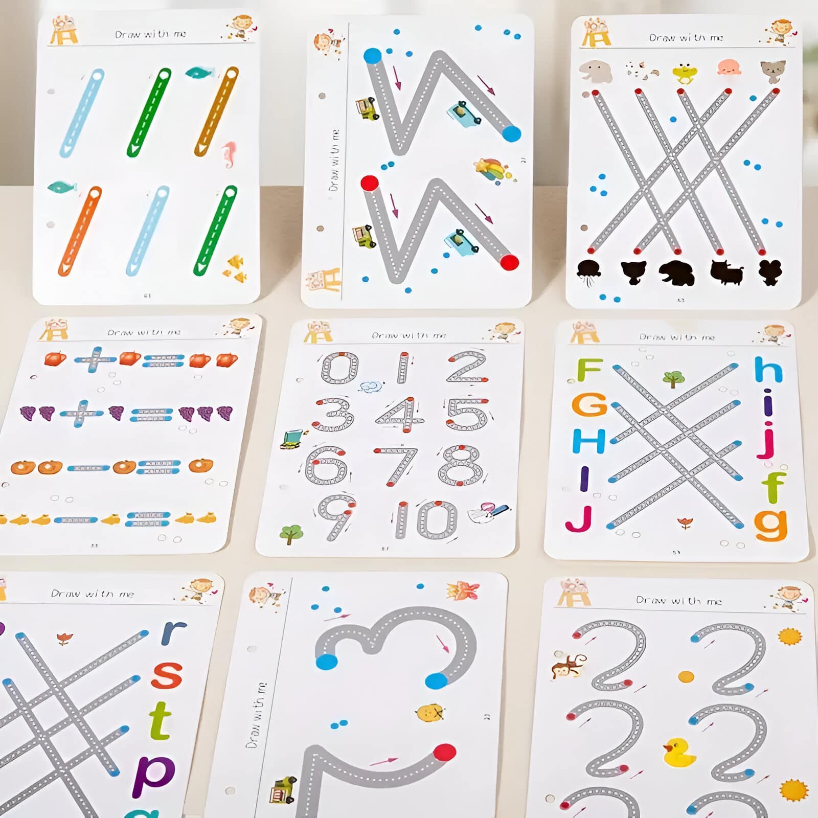 Incluye cuaderno reutilizable de 52 hojas, bolígrafos borrables, portador y borrador, ideal para aprender sin límites.