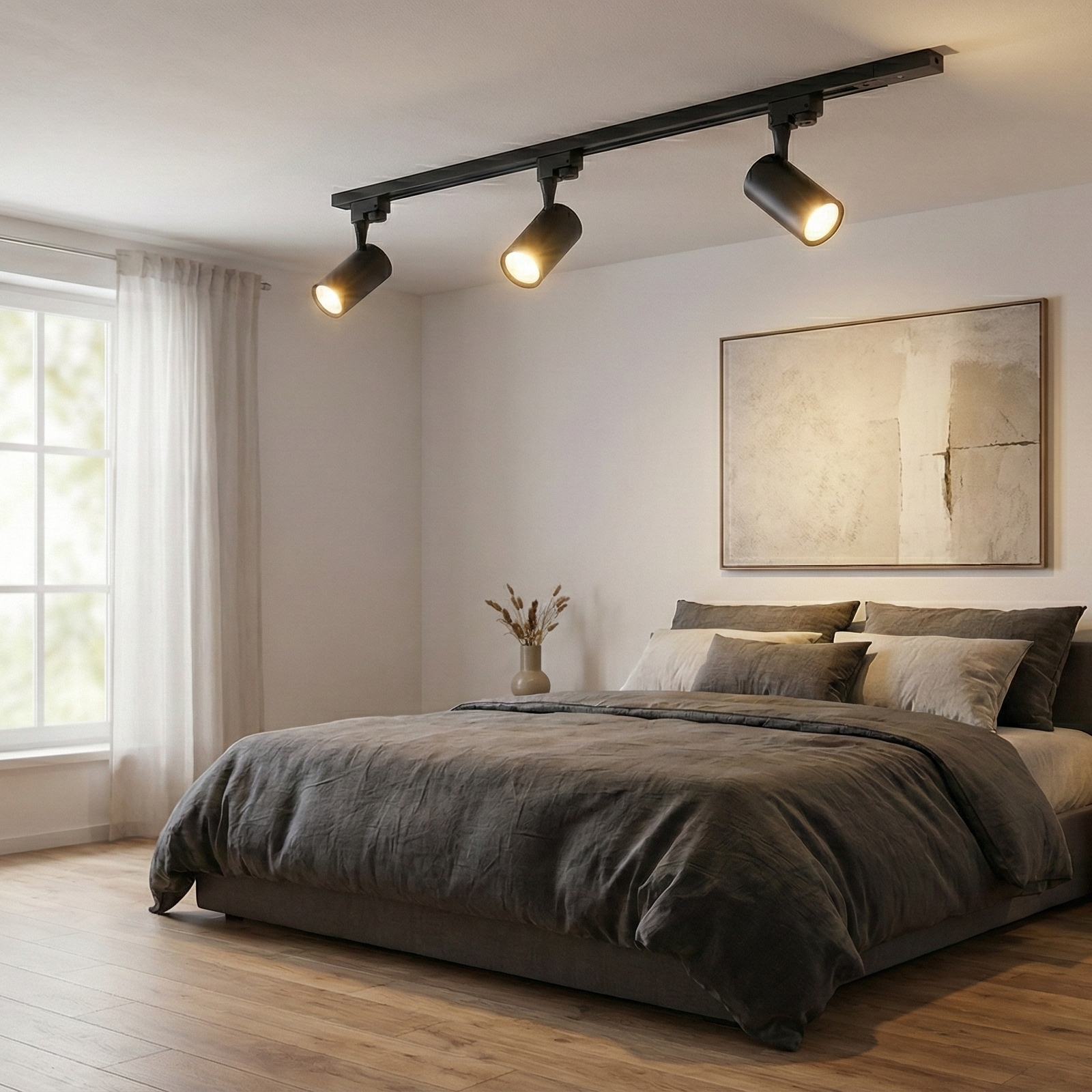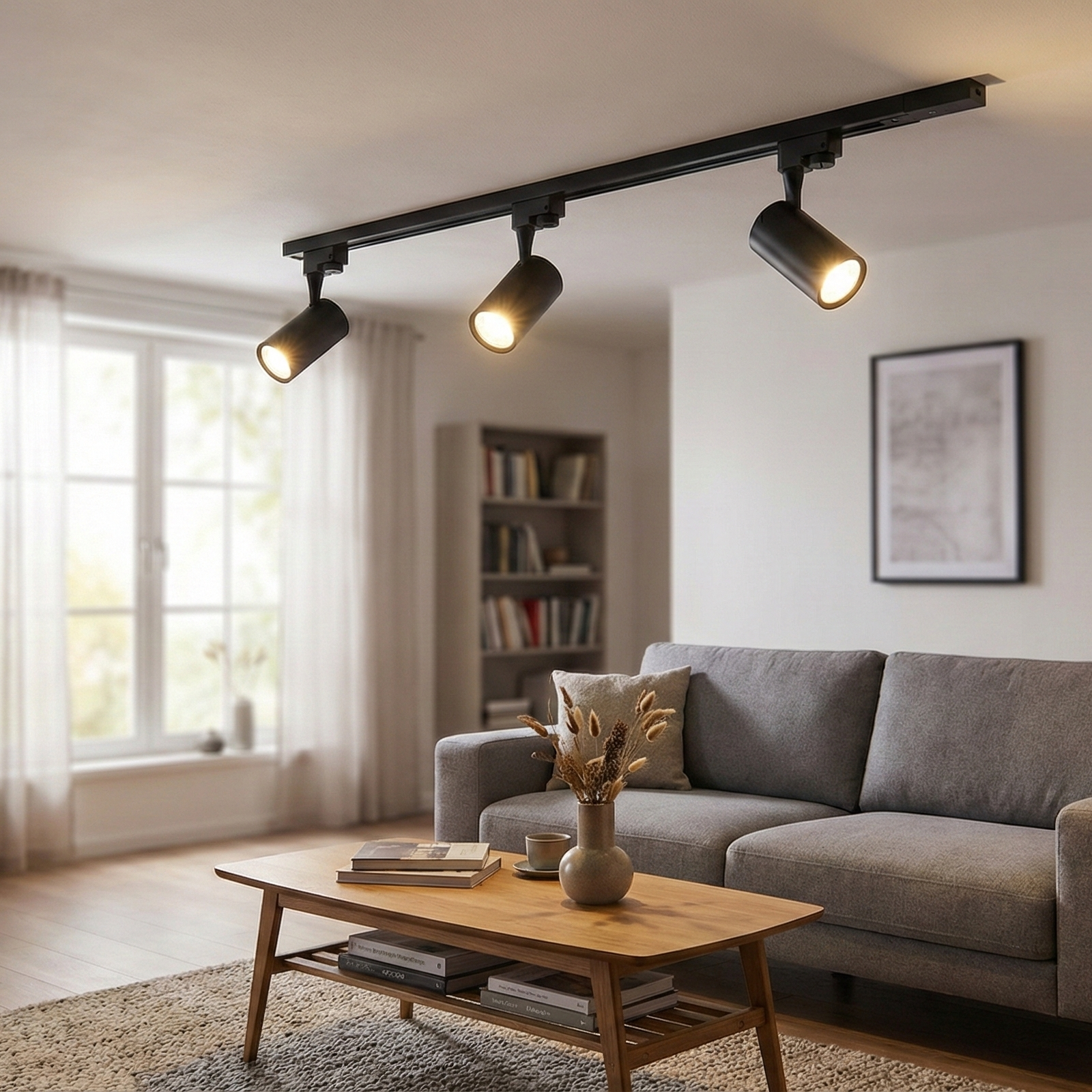 Luminaria de riel con 3 focos orientables, ideal para destacar ambientes con un diseño moderno y práctico.