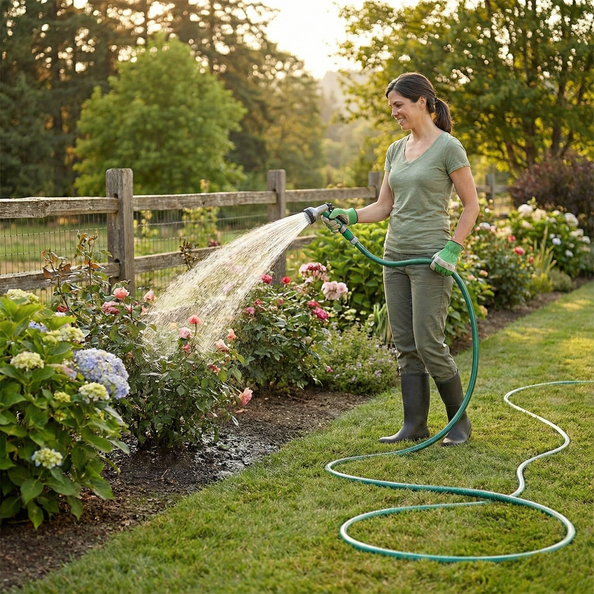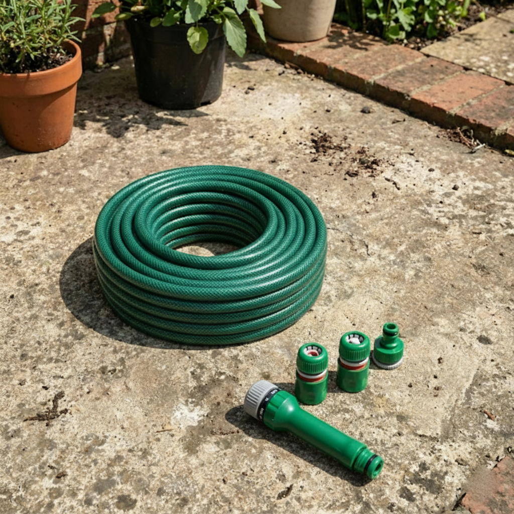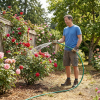Manguera ideal para el riego diario de jardín y patio. Flexible, resistente y lista para usar con el conector incluido.