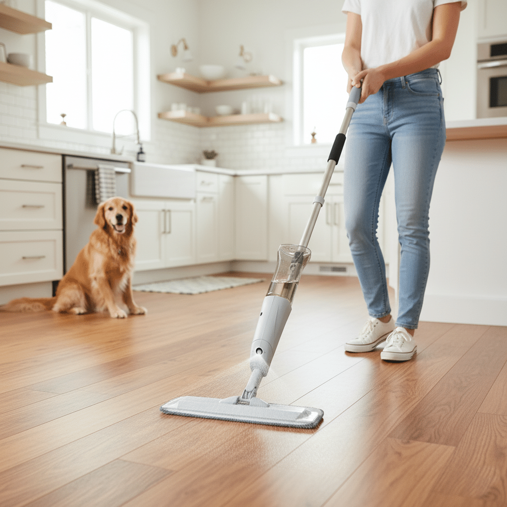 Mopa giratoria con pulverizador que deja tus pisos impecables sin esfuerzo extra.
