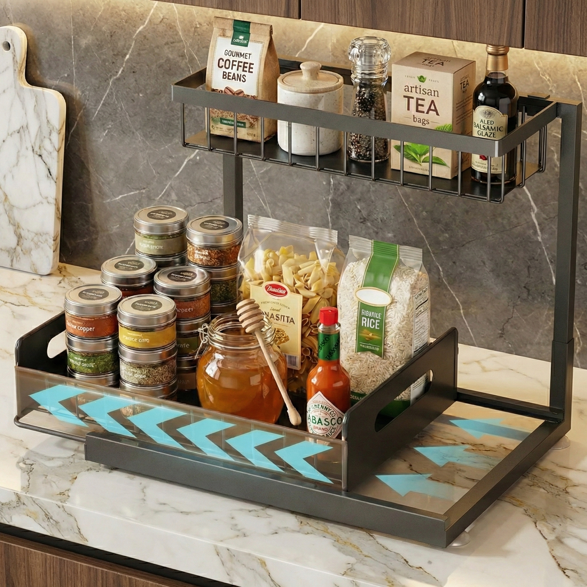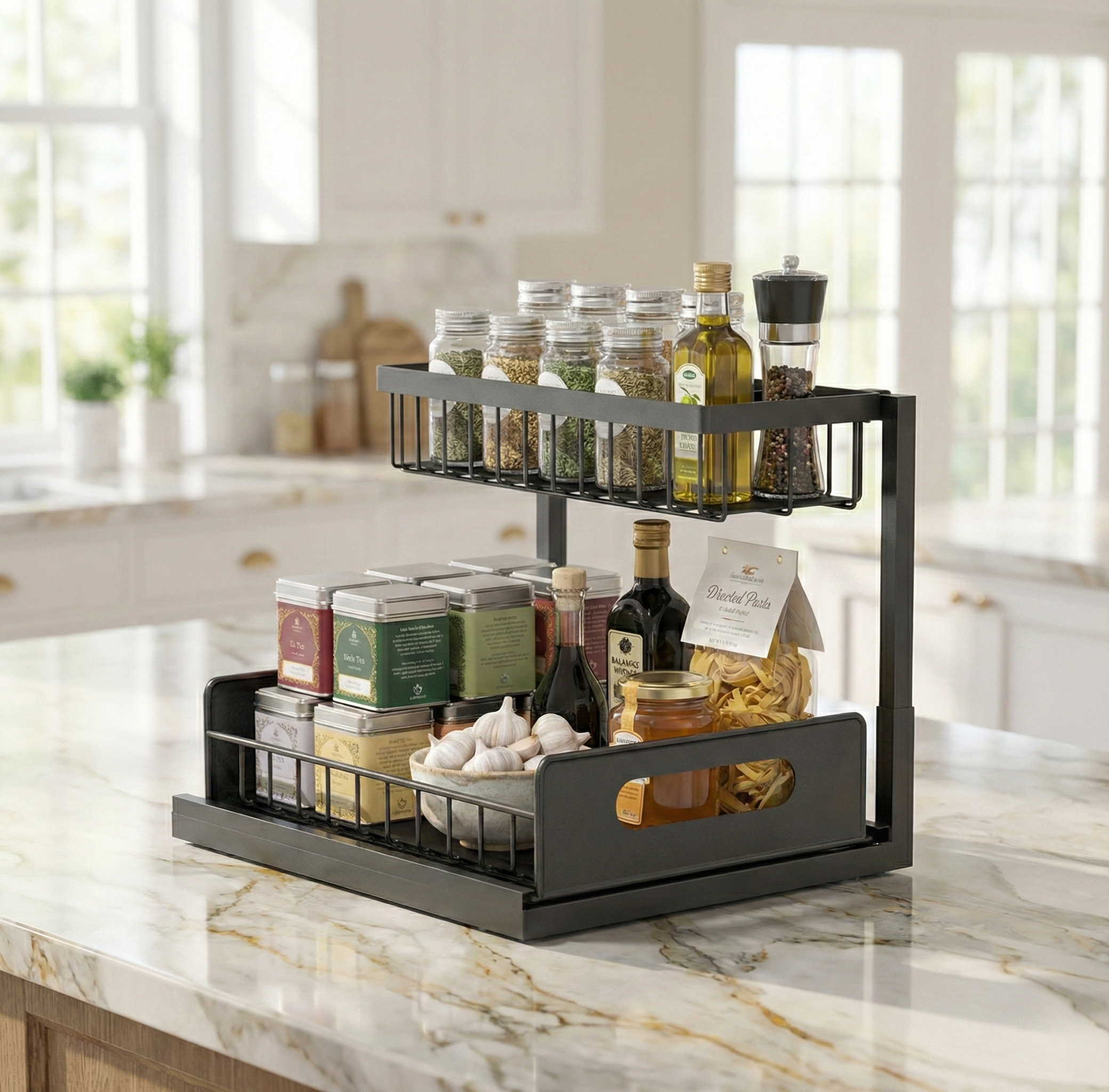 El Organizador Deslizante de 2 Niveles para Bajo Mesada es perfecto para mantener tus utensilios y productos de cocina organizados