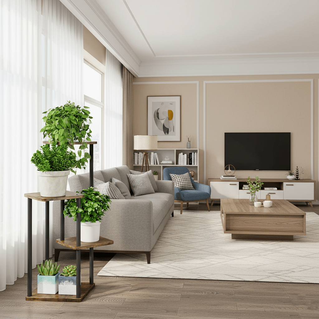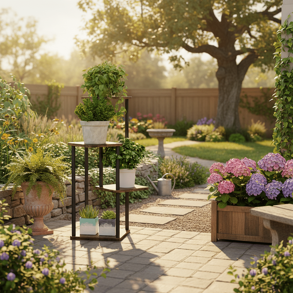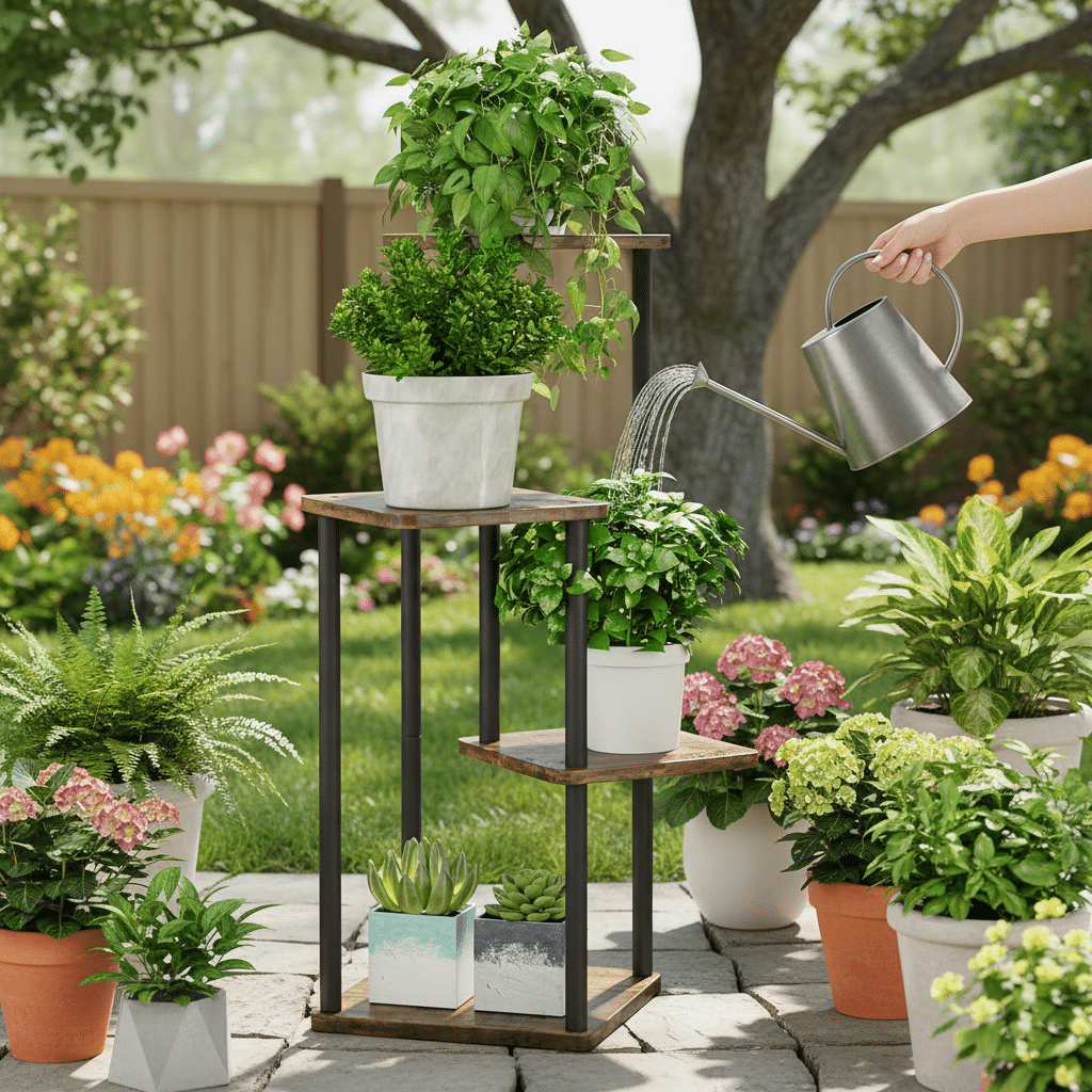 Soporte de 3 niveles para plantas, ideal para decorar tu hogar con un toque natural y elegante.