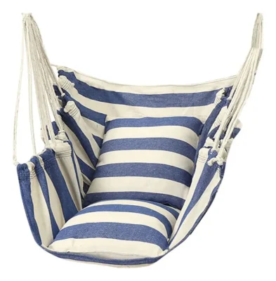 Material: Lona de poliéster y algodón (hamaca) + algodón de seda (almohada) Tamaño: 1 x 1,3 m Color: Azul y blanco Peso: 1,4 kg